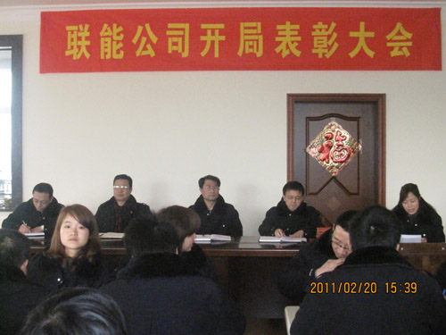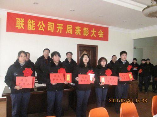 2011年 2月20日下午,浙江联能电气有限公司全体员工在公司礼堂召开了新年开局表彰大会。公司董事长李杰参加了会议,会议由董事长助理葛其运主持。在会上首先由各部门负责人针对出现的问题进行了表态性发言。同时还对在2010年工作成绩突出“先进生产工作者、优秀新人和优秀员工”进行了表彰奖励并佩戴了大红花!先进代表还上台发表了获奖感言!