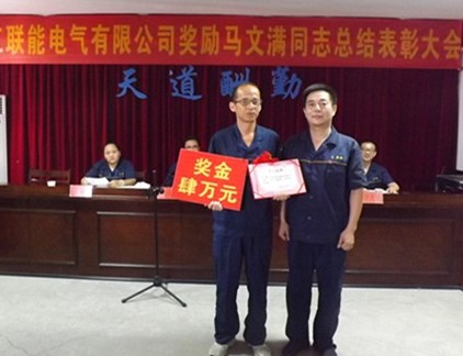 2014年8月8日下午,联能公司召开了奖励马文满同志总结表彰大会,会上对在售后服务工作中表现突出的马文满、郑勇同志授予“工程项目突出贡献奖”奖项并给予重奖,马文满同志发表了获奖感言。 董事长号召全体员工以受表彰的获奖者为榜样,学习他们爱岗敬业、无私奉献的精神,学习他们工作中的大局观,发挥实干精神,为联能的进一步发展作出自己的贡献!