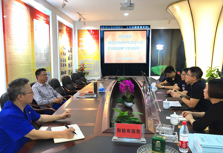 2019年6月13日上午,施耐德海外总包业务部、全国销售部曹总一行莅临联能电气考察。联能电气董事长李杰、总经理姜松峰,施耐德海外EPC林霖经理、销售运营许航经理参加了考察。