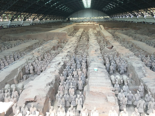 第四天,秦始皇兵马俑博物馆。这是一座建立在兵马俑坑原址上的遗址性博物馆,被誉为“世界第八大奇迹”。讲解员给我们讲解兵马俑发现过程,后经考古工作者的精心勘探和挖掘出规模宏伟的大型兵马俑坑(即一号俑坑)。关于兵马俑的不解之谜有很多,其一兵马俑彩绘物质只在超导世界存在,目前世界还未发现如此高科技合成物怎会出现在两千年的秦朝;其二出土的青铜器埋在地下两千多年光亮如新,发现采用了电子镀铬技术,而这项技术到20世纪才出现,当年如何处理无法解释。最后最充满神秘的无疑是骊山脚下的始皇陵,据记载陵园工程之浩大,用工人数之多,用时之长前所未有,至今仍没有对其一探究竟,希望在有生之年可以目睹始皇陵的威武。