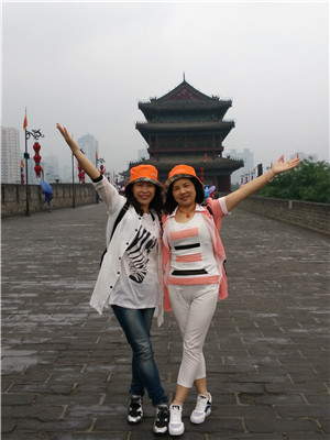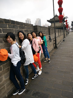 27日上午十时许我们顺利抵达西安,一下火车站,西安给我的第一印象是古老,继而一种强烈的厚重感就包裹着我的全身。清点好各组的人数后在导游的带领下我们直奔西安的古城墙。古城墙位于西安市中心,共有四座城门(东西南北),短短的40分钟时间里,我们几个人一边尽情地拍照留念,一边感受着古代城墙的气氛,感觉超好!