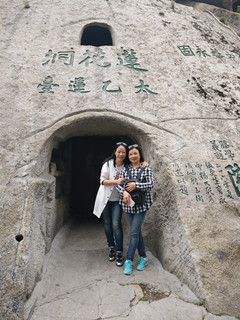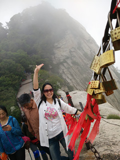 要说整个行程的亮点,华山之旅我认为最有价值的,也是最美的一处景点。很早就听说,华山以“险,峻”闻名于世,从我踏上去北峰的缆车,随缆车往上升的那一刻起,我就见证了这一点。在西峰的攀登过程中,我的第一感觉就是山体的陡峭,一个个的山体似乎都是由一块大岩石构成的,且坡面异常光滑,几乎成九十度状矗立,让人有一种不寒而栗的感觉。如此陡峭的山峰,其山路之险峻可想而知,一米宽的石头小道,梯级直接是在岩石上开凿出来的,陡峭时高度很小,只容一个小碎步。由于我和铁梅二个人制作铜心锁耽误了些时间,和几个小姐妹暂时“失去了联系”,俩人只好相互鼓励结伴而行,此时的我脚有点发颤,手也不由自主地握住路旁的铁链,连走上一级台阶都要花上三四秒的时间,更不要提向后面张望一下,甚至连身旁那云雾缭绕的美丽景色都不敢再多看一眼,直至登上了西峰,我长舒了一口气,转身向身后望去,才发现原来它是那么的美丽迷人:完全被云雾给淹没了,像是一架从天而降的天梯!更奇特的是远处的一些山峰大半个身体被云雾吞蚀了,只留下了山尖,这就更让人有种似乎走进了仙境,看到了飘浮在云雾上空的仙岛的错觉。站在山底下仰视华山犹如云梯的石道,心想登高而望远的人可能会欲尝又止,心有余而力不足。因此,攀登华山的人必须得有毅力和勇气。
