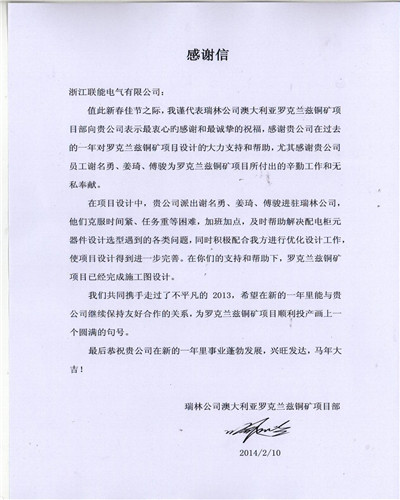 2012年,联能电气中标澳大利亚罗克兰兹选矿E-HOUSE项目,项目制作前期从毫无头绪到思路清晰,联能电气化了三年的时间,通过引进西门子技术、研究西门子公司设计方案及澳大利亚工业标准,全面进行消化吸收后大胆进行技术创新,为罗克兰兹选矿厂项目提供了专业化、个性化的服务。在合作伙伴的大力支持下,2014年6月,该项目五方验收组莅临联能公司对本项目的产品进行整体验收,认为该产品完全符合澳大利亚标准及IEC国际标准,产品优质、优良,一次性通过验收! 在后续E-HOUSE现场集成安装过程中,联能电气提供了大量细致的工作,为工程顺利完工提供了可靠的保障,成功地兑现了自身的承诺,受到了海内外合作伙伴的一致赞誉!并为中国电气领域竖起一面新的旗帜!这是全体联能人努力工作、敢于担当、奋勇拼搏的结果!