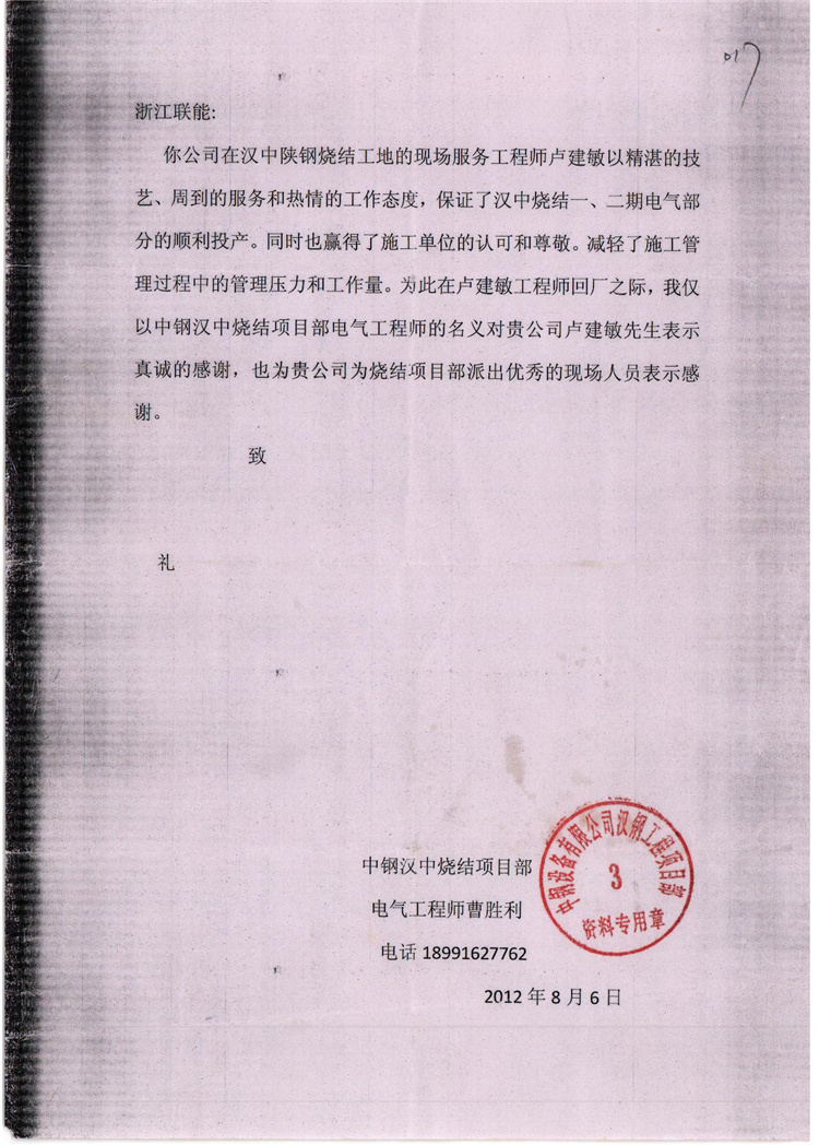 2012-8中钢汉中烧结项目感谢信