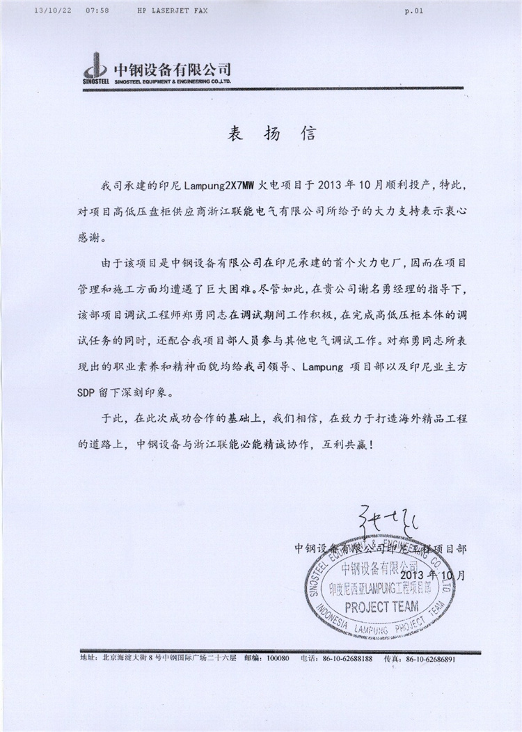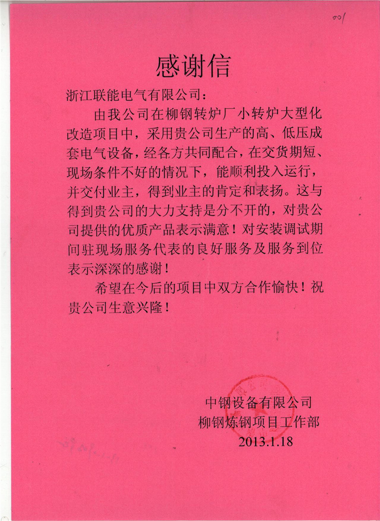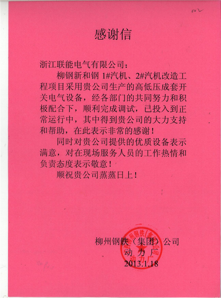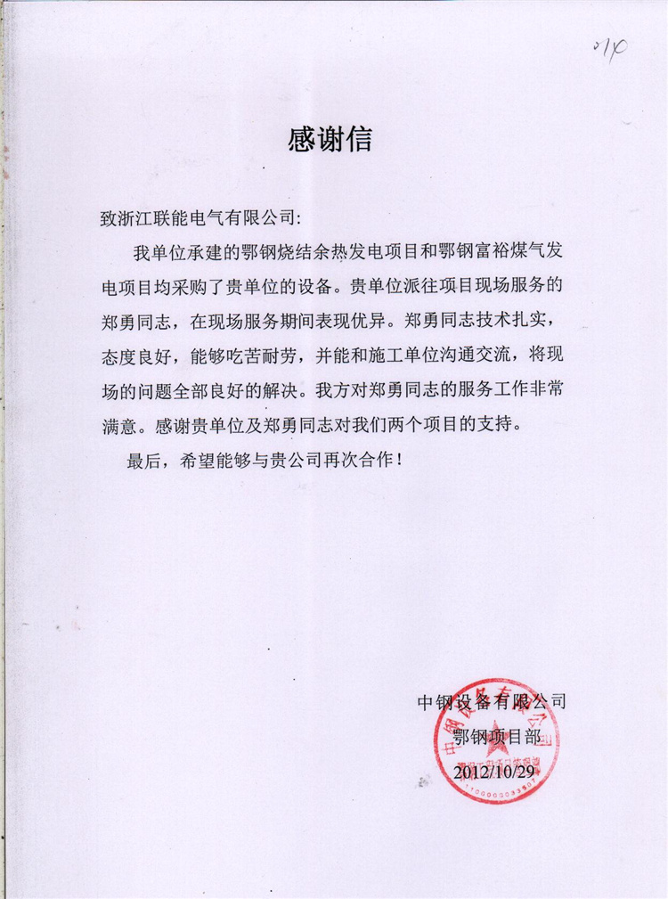 2012-10鄂钢项目感谢信